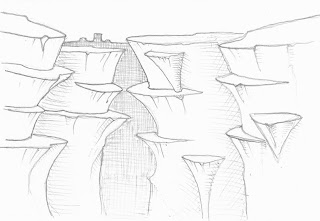A castle in the Dusk Hollows. Gotta start using a straight edge for sketches, as this one is pretty skewed. Started off as just a building but only had strange round windows and so I imagine that dragons fly in an out of those as access.